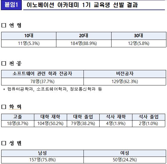 > SW 비전공자가 62.3%...24일부터 본교육 실시(지디넷코리아=방은주 기자)정부가 실무 역량을 갖춘 우수 소프트웨어(SW) 인재 양성을 위해 설립한 '이노베이션 아카데미(이노아카)'가 1기생 207명을 최종 선발, 24일부터 본교육을 실시한다.