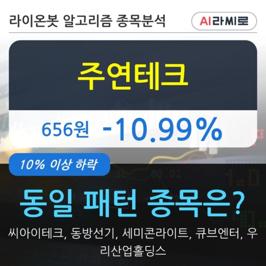 주연테크이 시각 거래소에서 주연테크 이외에도 씨아이테크(-16.48%), 동방선기(-10.9%), 세미콘라이트(-10.68%), 큐브엔터(-21.03%), 우리산업홀딩스(-10.12%) 등이 하락세를 보이고 있다.
